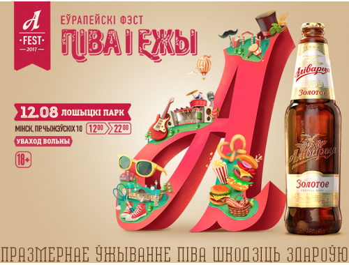 Грандиозный фестиваль A-FEST пройдет 12 августа в Лошицком парке при спонсировании бренда «Аливария». Праздник будет иметь все атрибуты, присущие европейскому отдыху: уличная еда, пикники на траве, конкурсы и соревнования, фотозоны, большой выбор сортов пива и концерт под открытым небом. В преддверии фестиваля «Аливария» проводит превечеринки в областных центрах, перевозя праздник на специальном автобусе BeerBus-е. Для каждой вечеринки заготовлены танцевальные флешмобы, мастер-классы, стрит-караоке и многое другое.